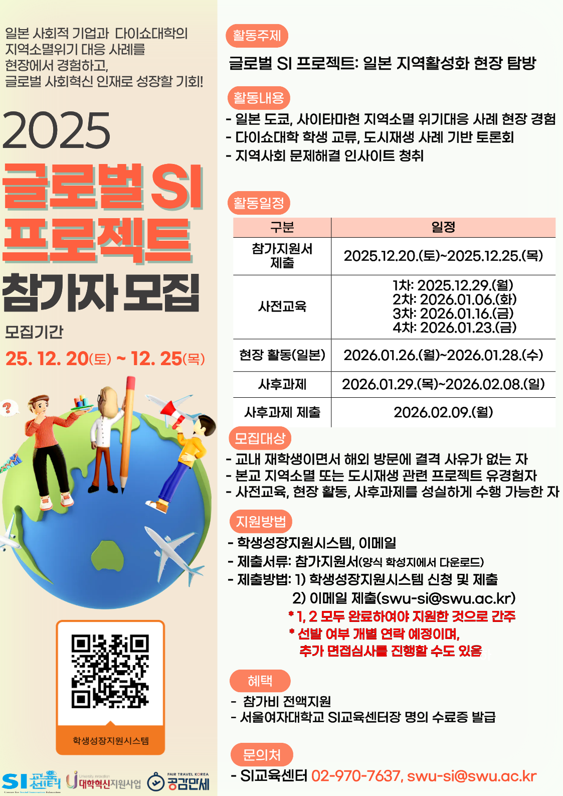 - 학생성장지원시스템에 첨부된 양식 활용: '지원서및자기소개서_2025학년도 글로벌 SI프로젝트- 이름 및 학번 작성.hwp'